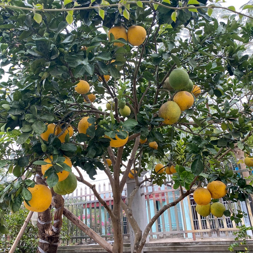 Quả bưởi nhỏ, tròn, màu vàng cam khi chín, có thể ăn được. Quả xuất hiện quanh năm tùy theo mùa, tượng trưng cho sự sung túc, đầy đủ và may mắn trong gia đình.